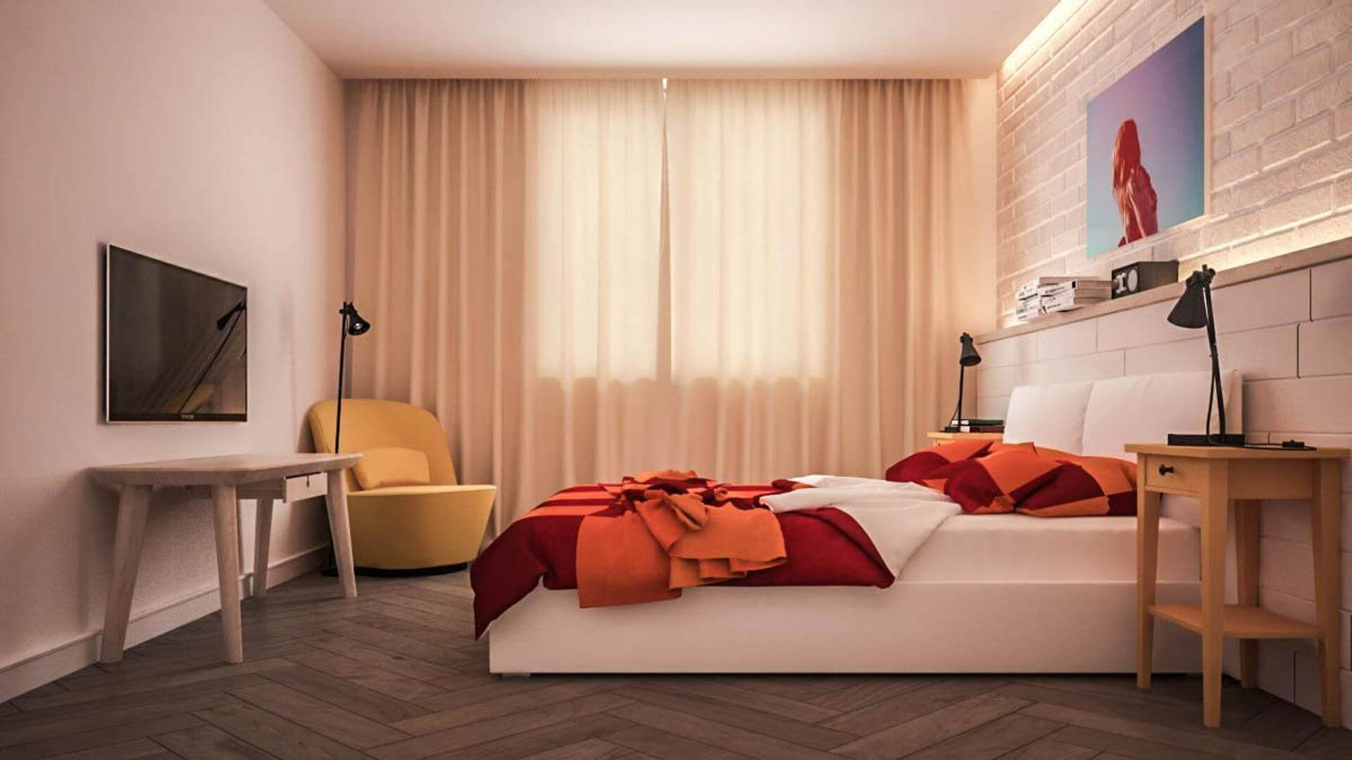 Спальная комната отделана с применением стиля рустик, большое количество дерева делает комнату более теплой. Практичная кровать-диван и стулья из одного гарнитура позволяют превратить спальню в уютную гостиную или кабинет, тем самым создавая многофункциональное помещение. Использование цветочных мотивов и ярких акцентных деталей сделает помещение по настоящему солнечным.