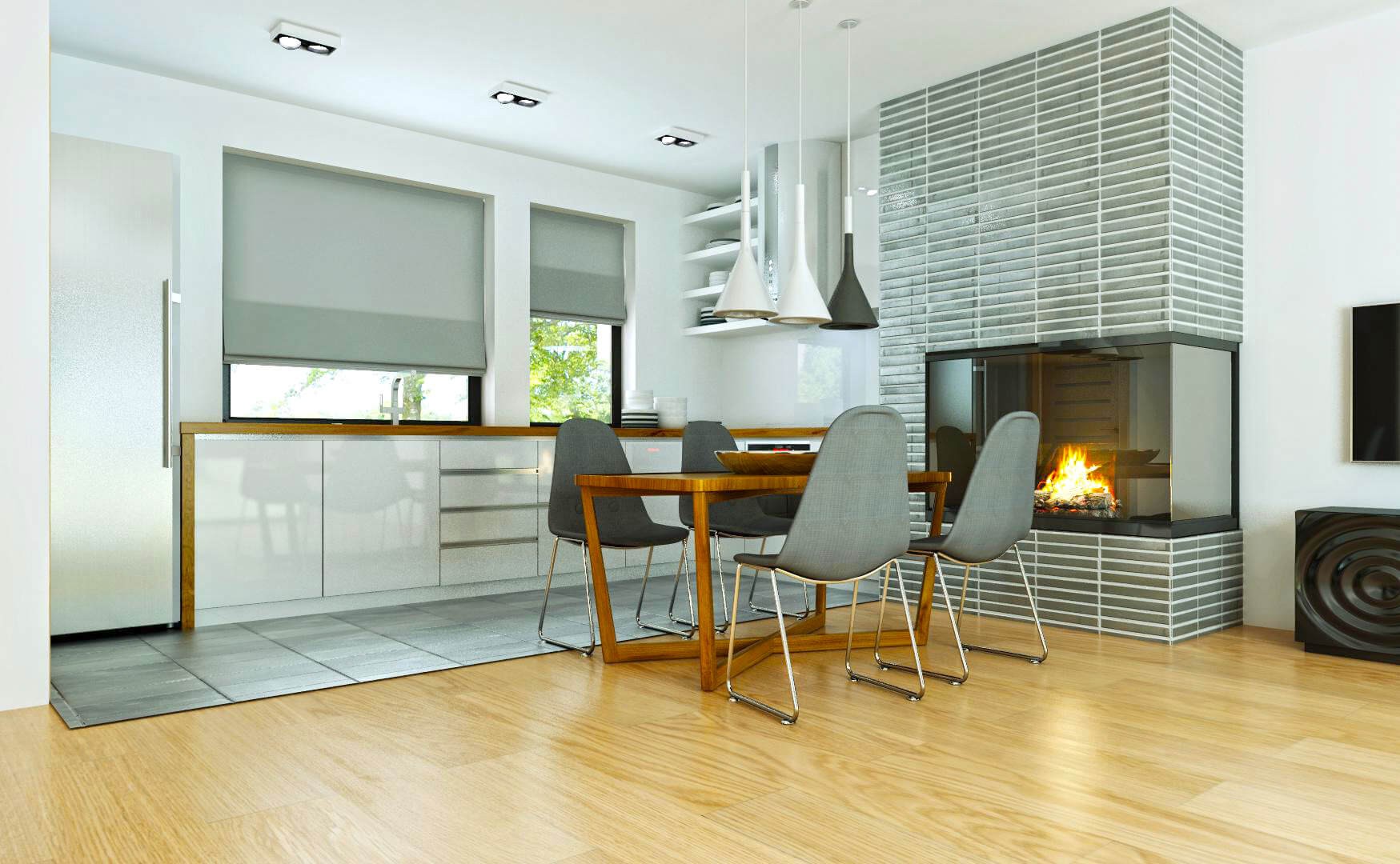 Кухня с функциями столовой в данном проекте также предназначена для создания комфортной и практичной рабочей и обеденной зоны. Встроенная мебель позволит хранить кухонную технику и приборы. Удобная столешница и достаточная рабочая столешница превратят процесс готовки в удовольствие. Камин в помещении добавит уюта, теплоты и превратит кухню в любимое место сбора членов семьи. При проектировании дома, камин может быть как классический с выходом, так и современный с жидким газом искусственный.