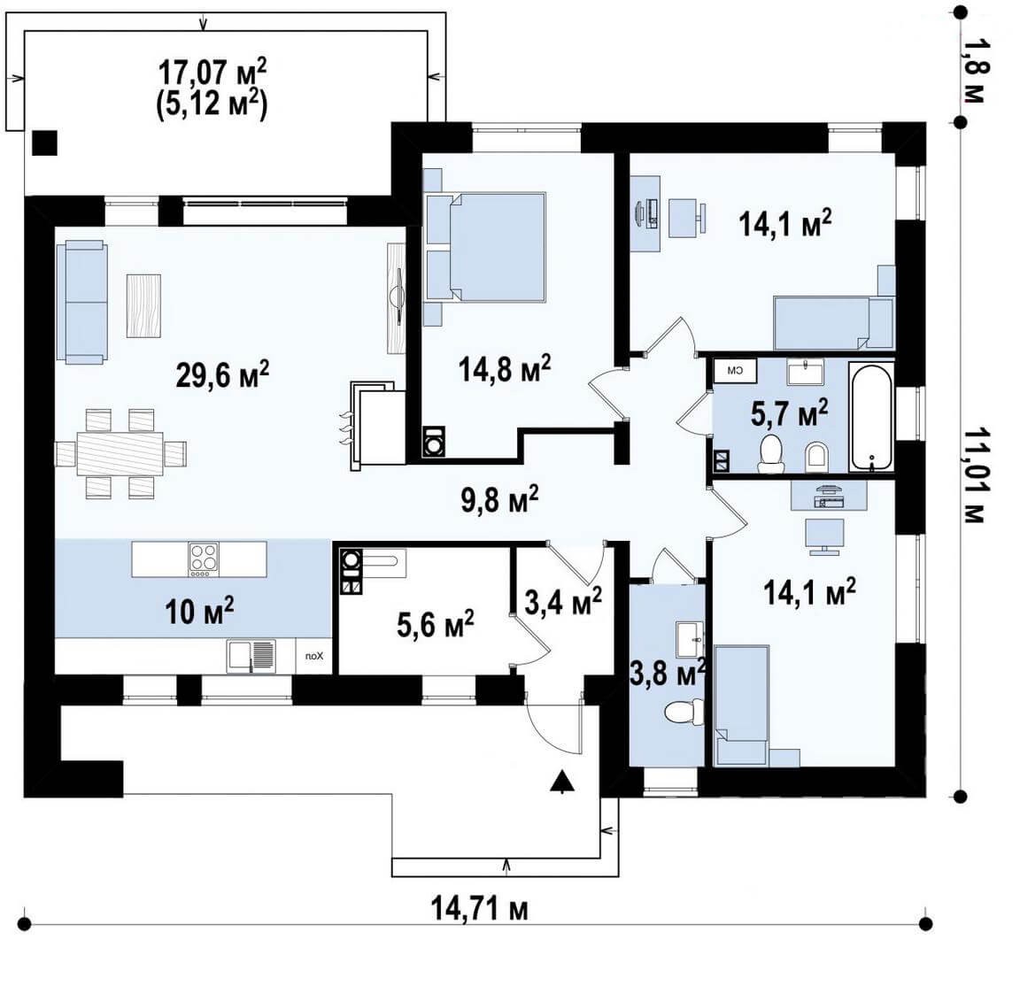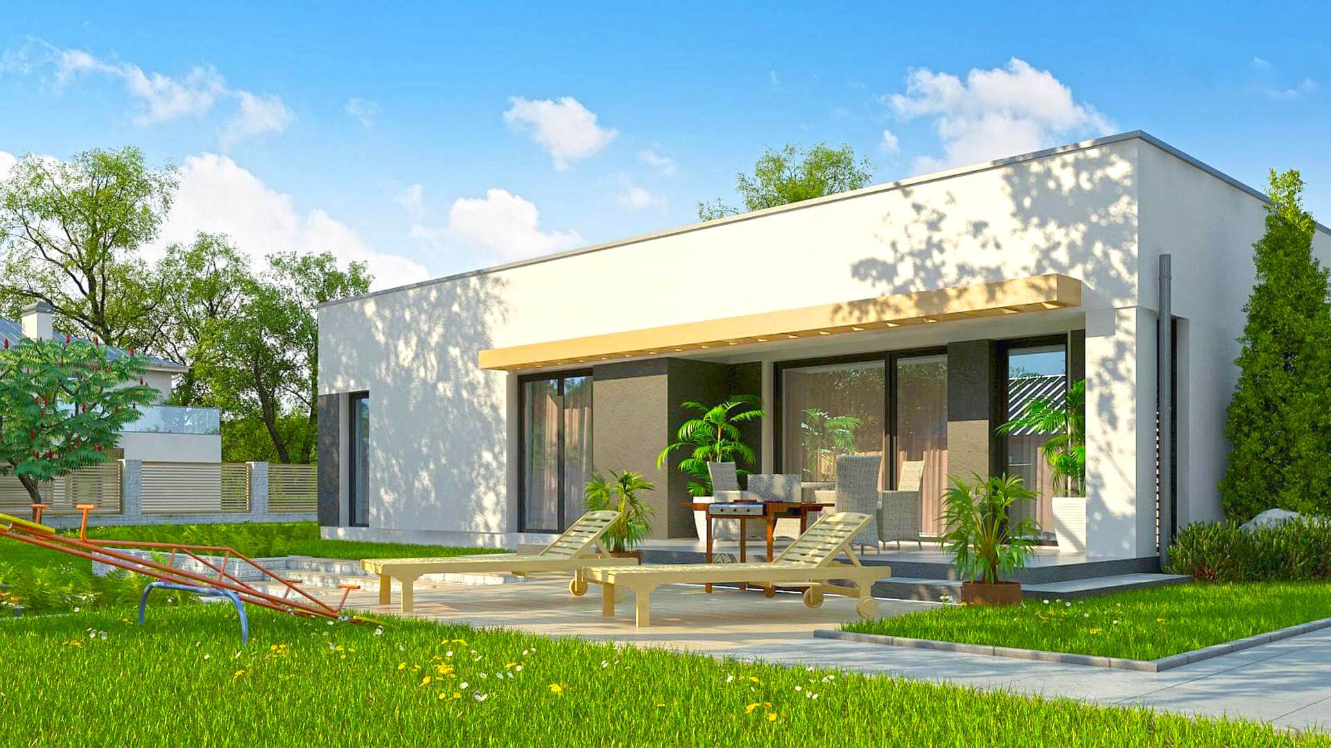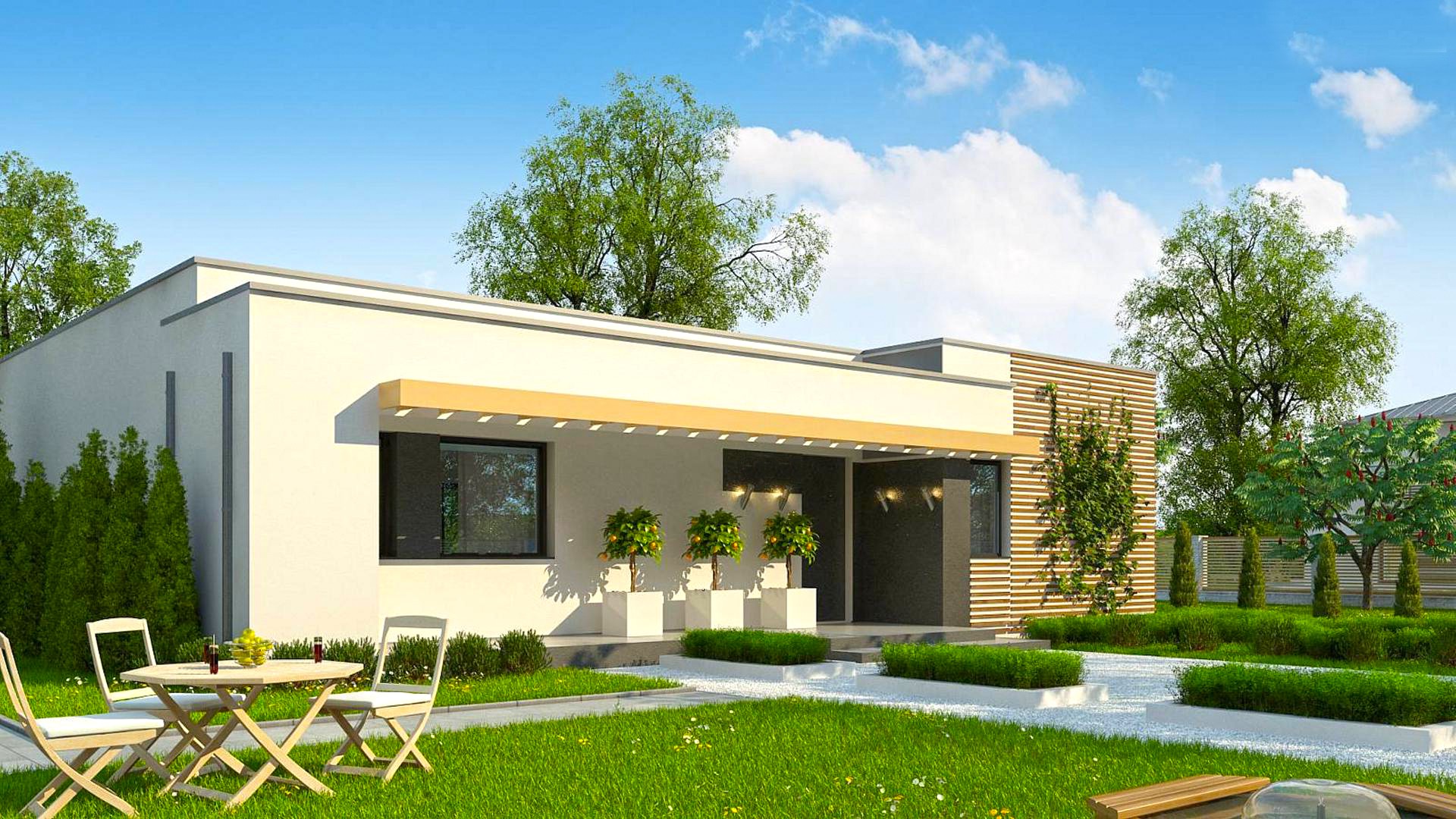 Современный комфортабельный одноэтажный дом с функциональным интерьером и уютной террасой.