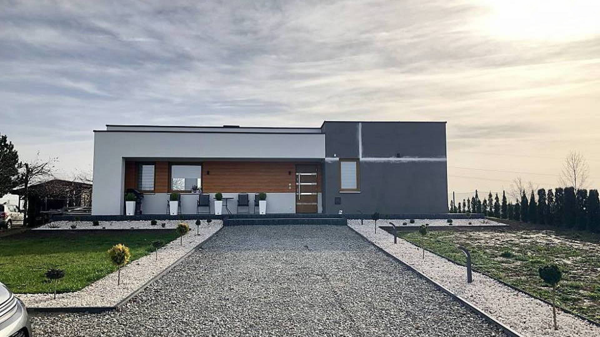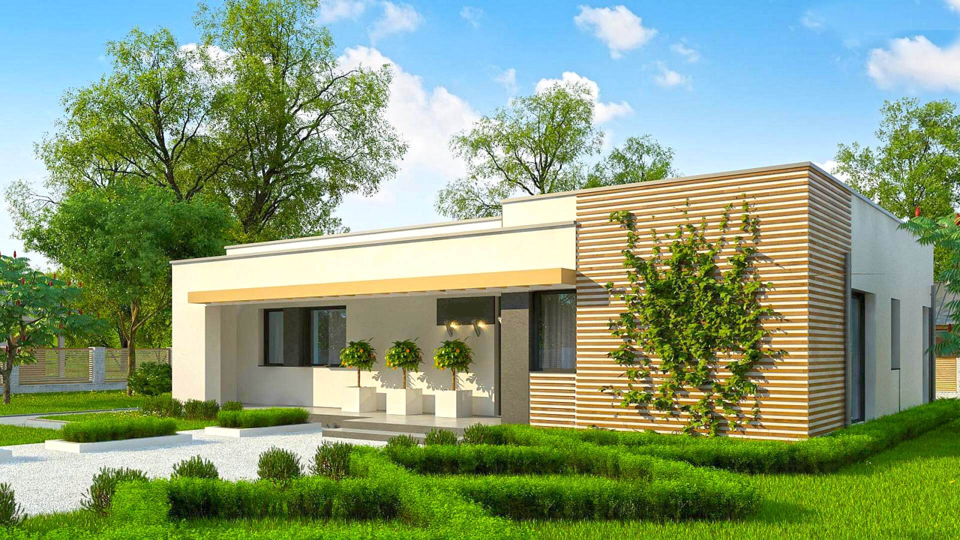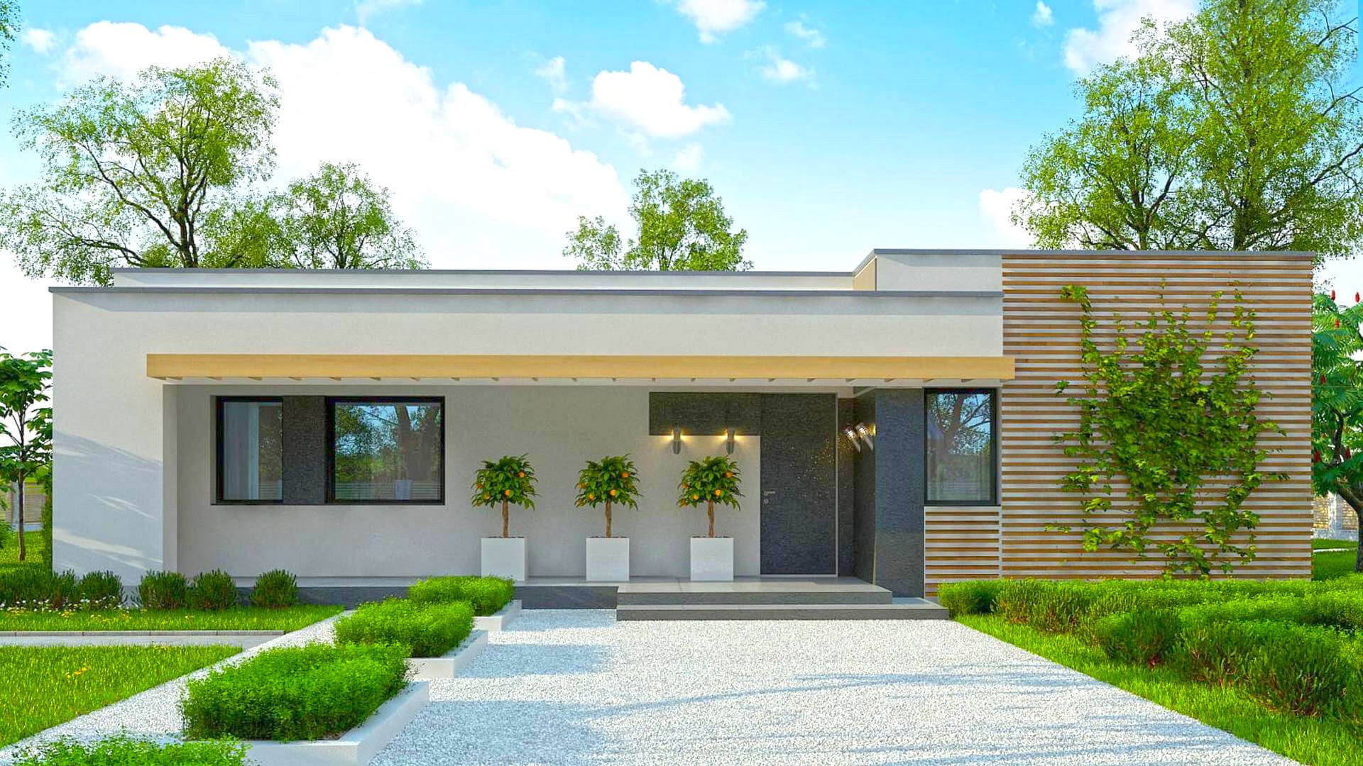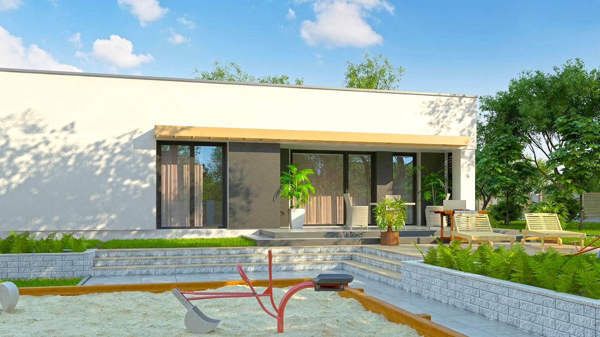 Современный комфортабельный одноэтажный дом с функциональным интерьером и уютной террасой.