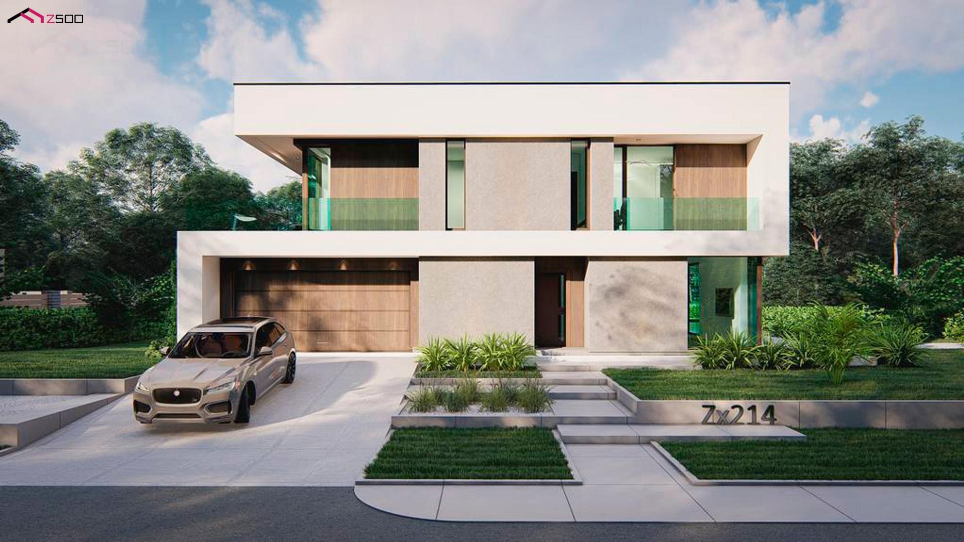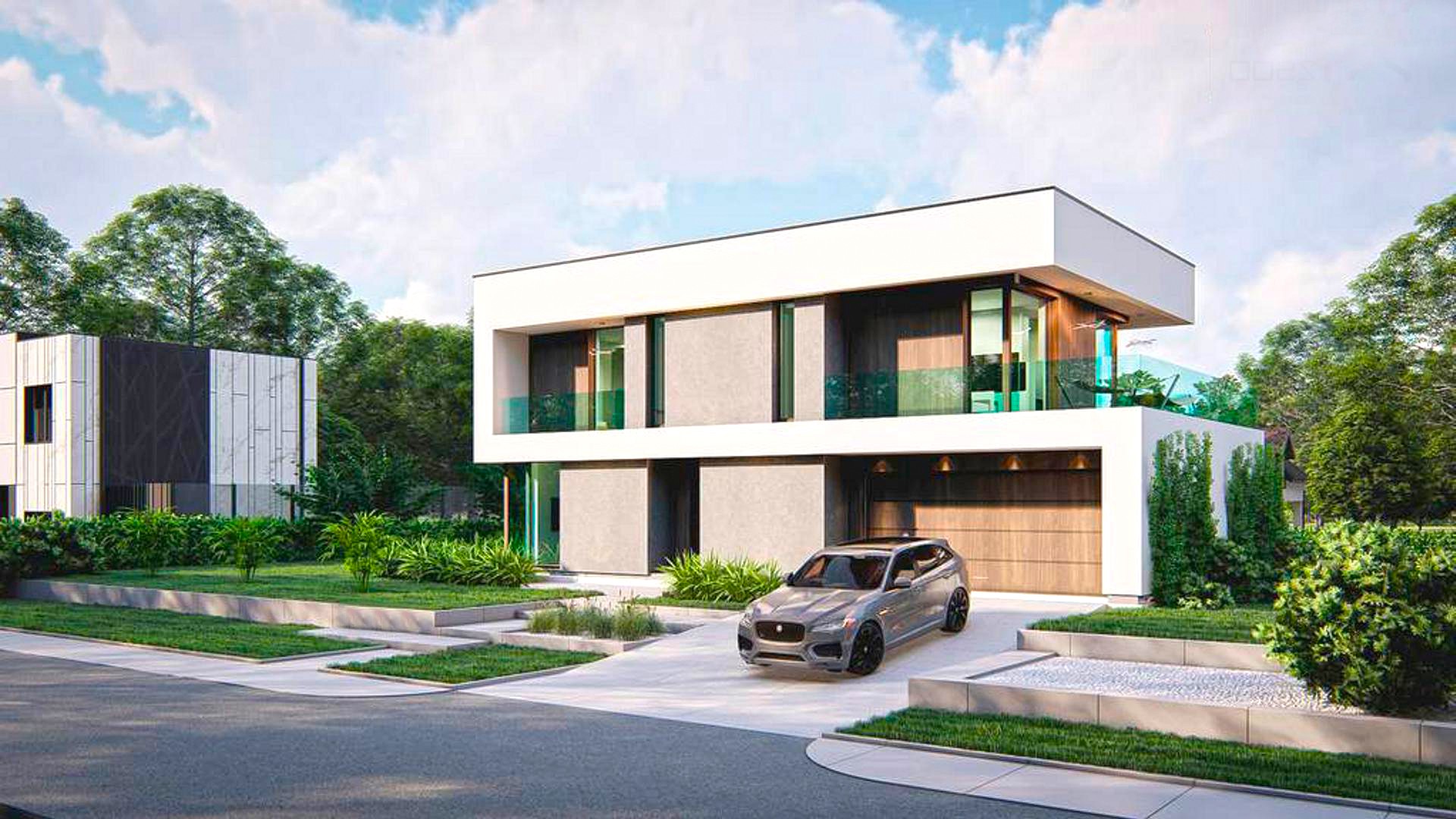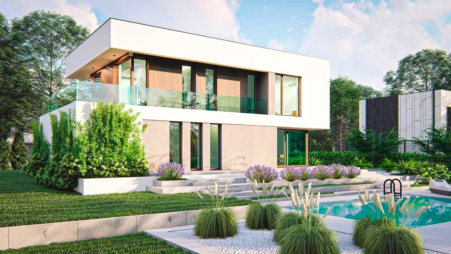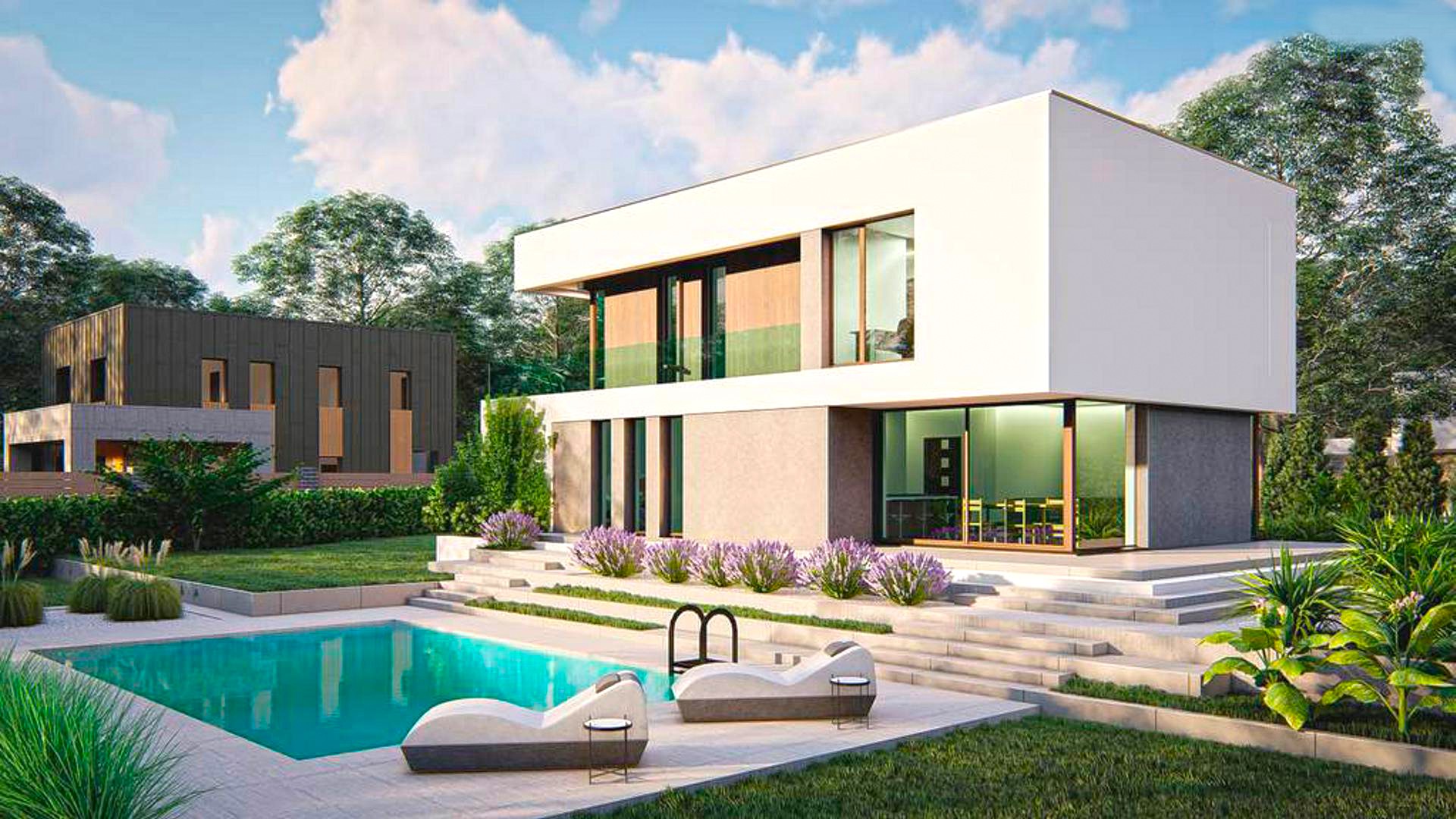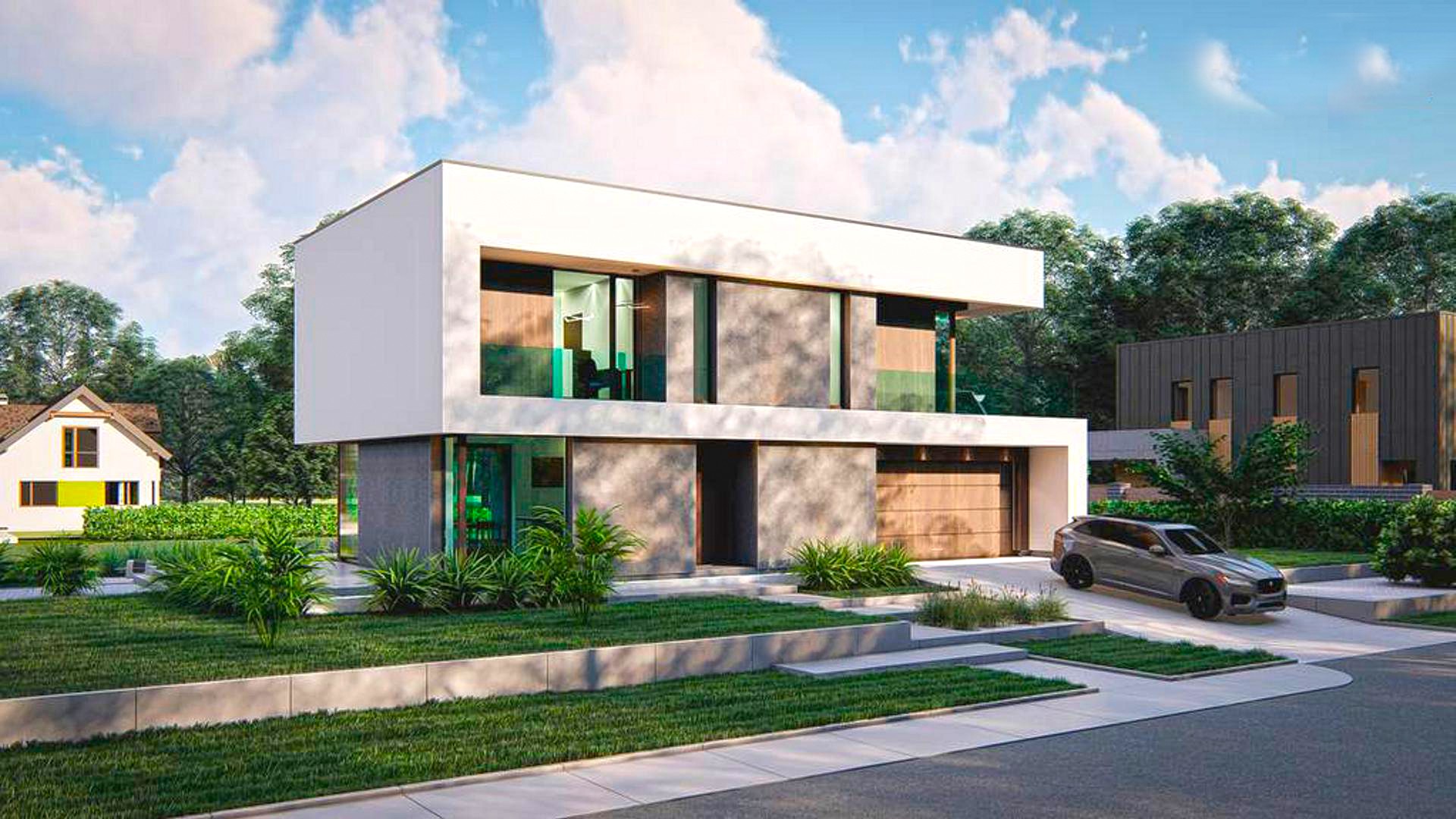 Двухэтажный дом в стиле хай-тек, построенный по современным технологиям, с плоской кровлей и новейшим остеклением.
