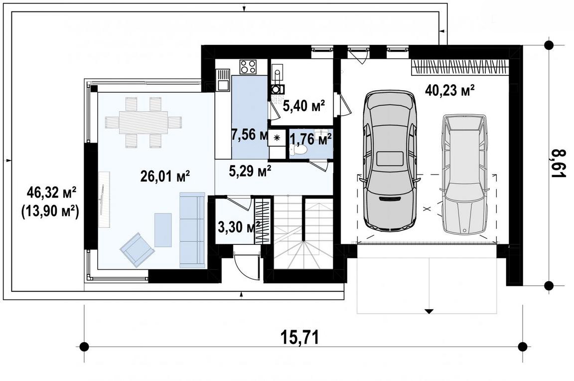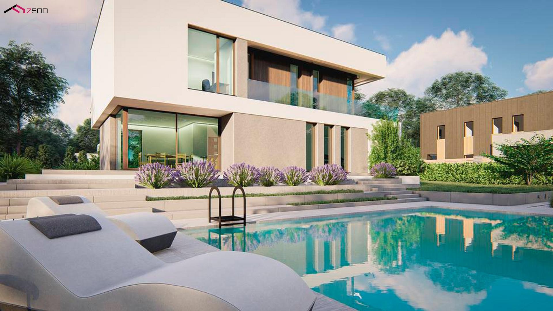 Готовый проект дома в два этажа с гаражом и бассейном