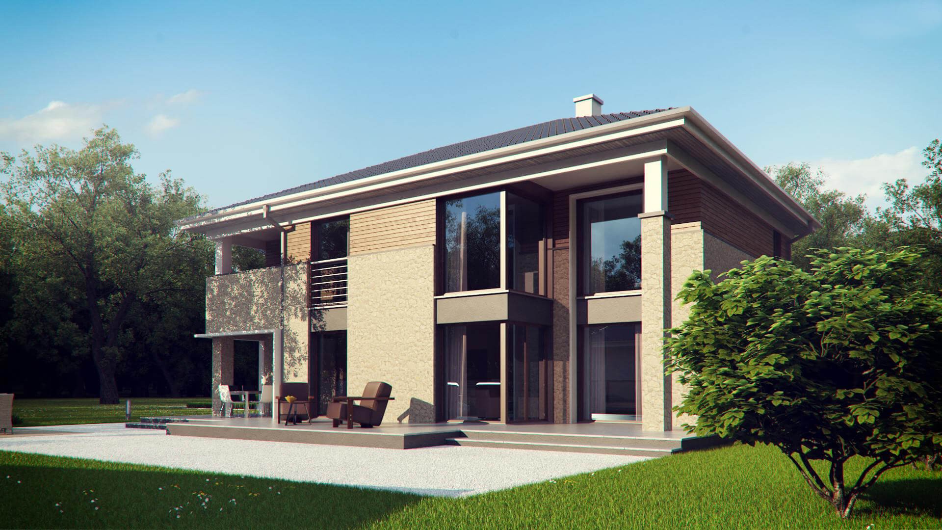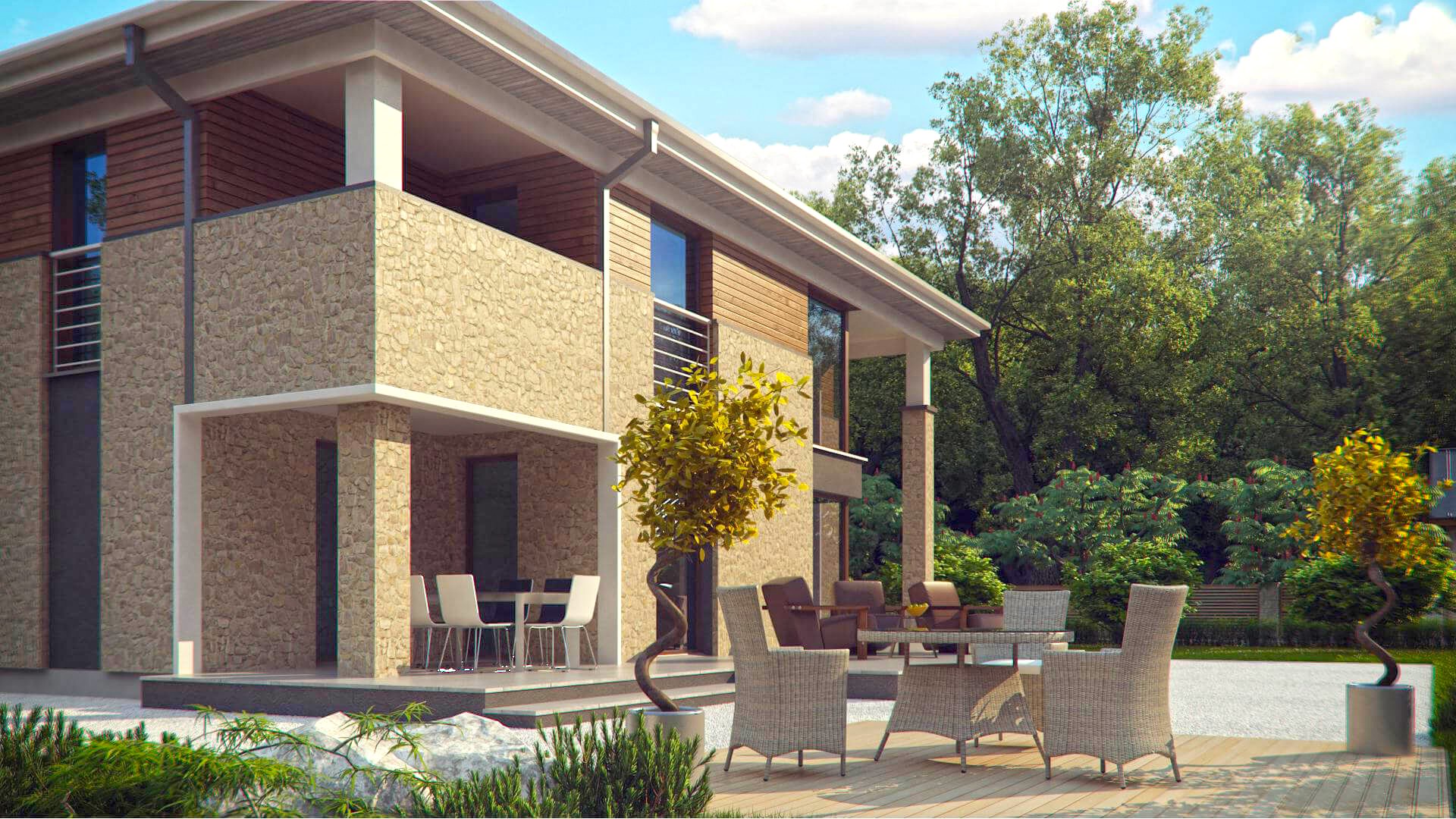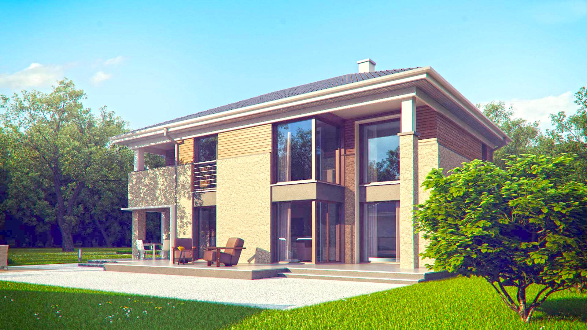 Современная двухэтажная вилла площадью 262 м2 станет украшением любого участка. Владельцы премиальных автомобилей оценят гараж на два места. Красивая и вместительная терраса возле дома позволит разместить по желанию как сад, так и бассейн.