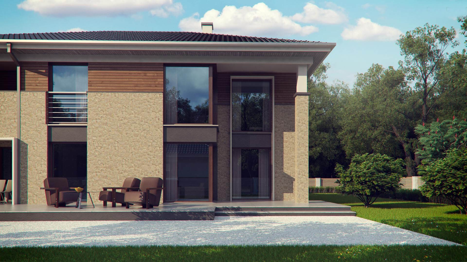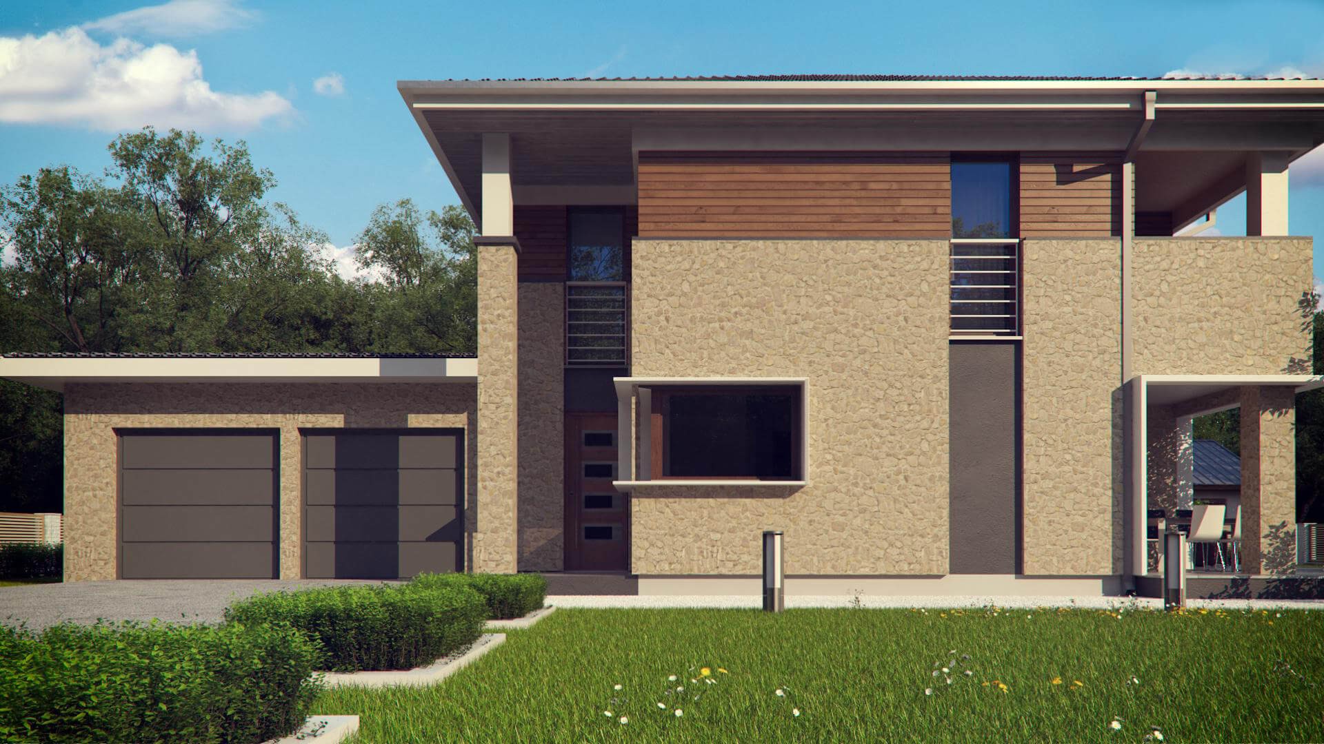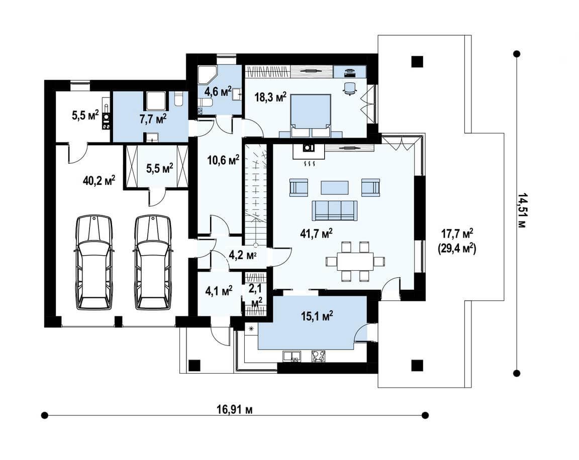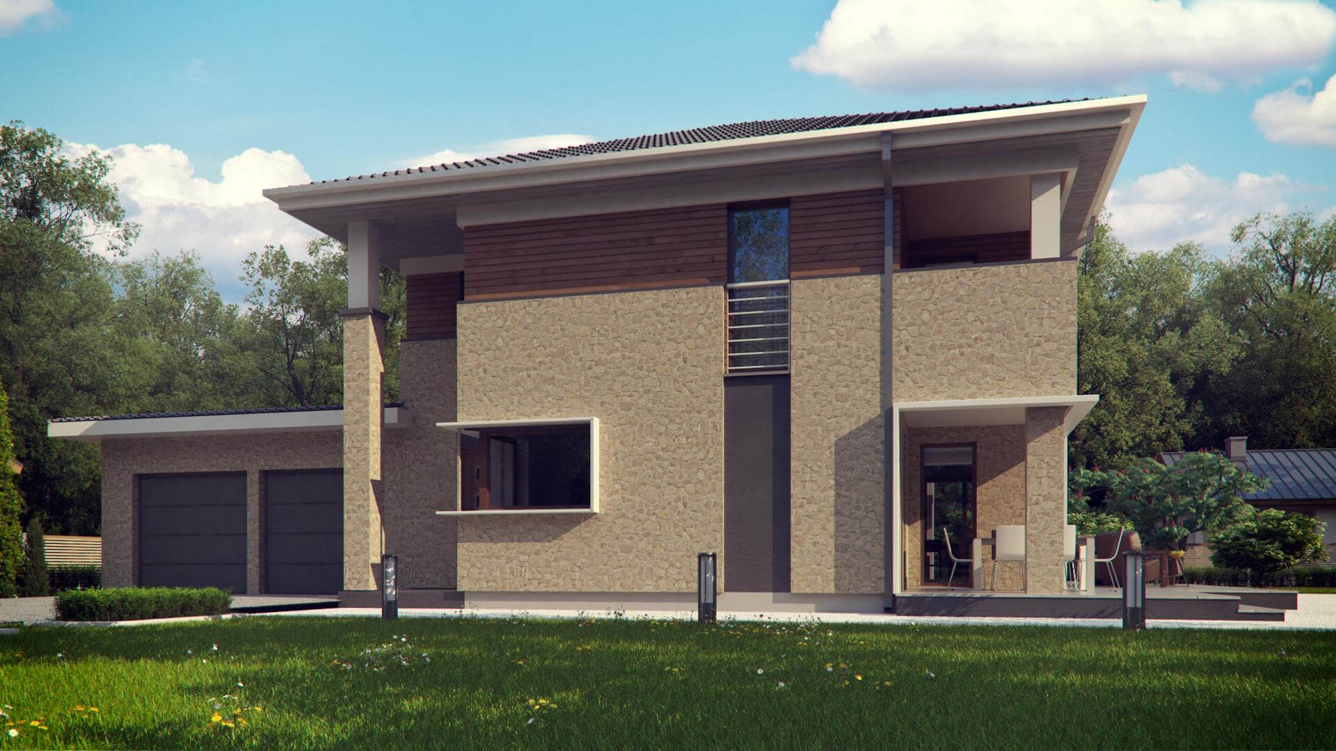 Современная двухэтажная вилла площадью 262 м2 станет украшением любого участка. Владельцы премиальных автомобилей оценят гараж на два места. Красивая и вместительная терраса возле дома позволит разместить по желанию как сад, так и бассейн.