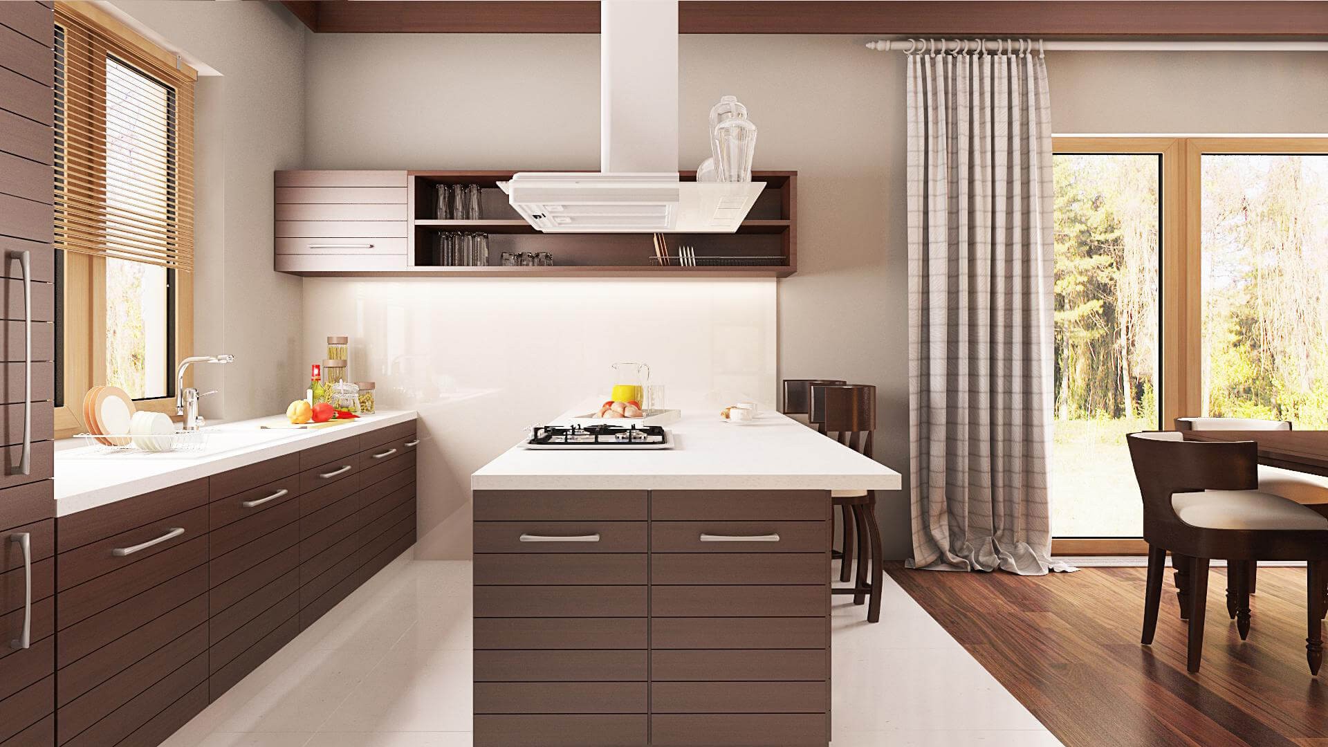 Кухня данного проекта разработана с максимальным удобством. Стены имеют панорамное остекление, которое позволяет максимально задействовать естественное освещение, предоставляя владельцам возможность максимального обозрения рабочей зоны, и в то же время создавая ощущение уюта и простора.