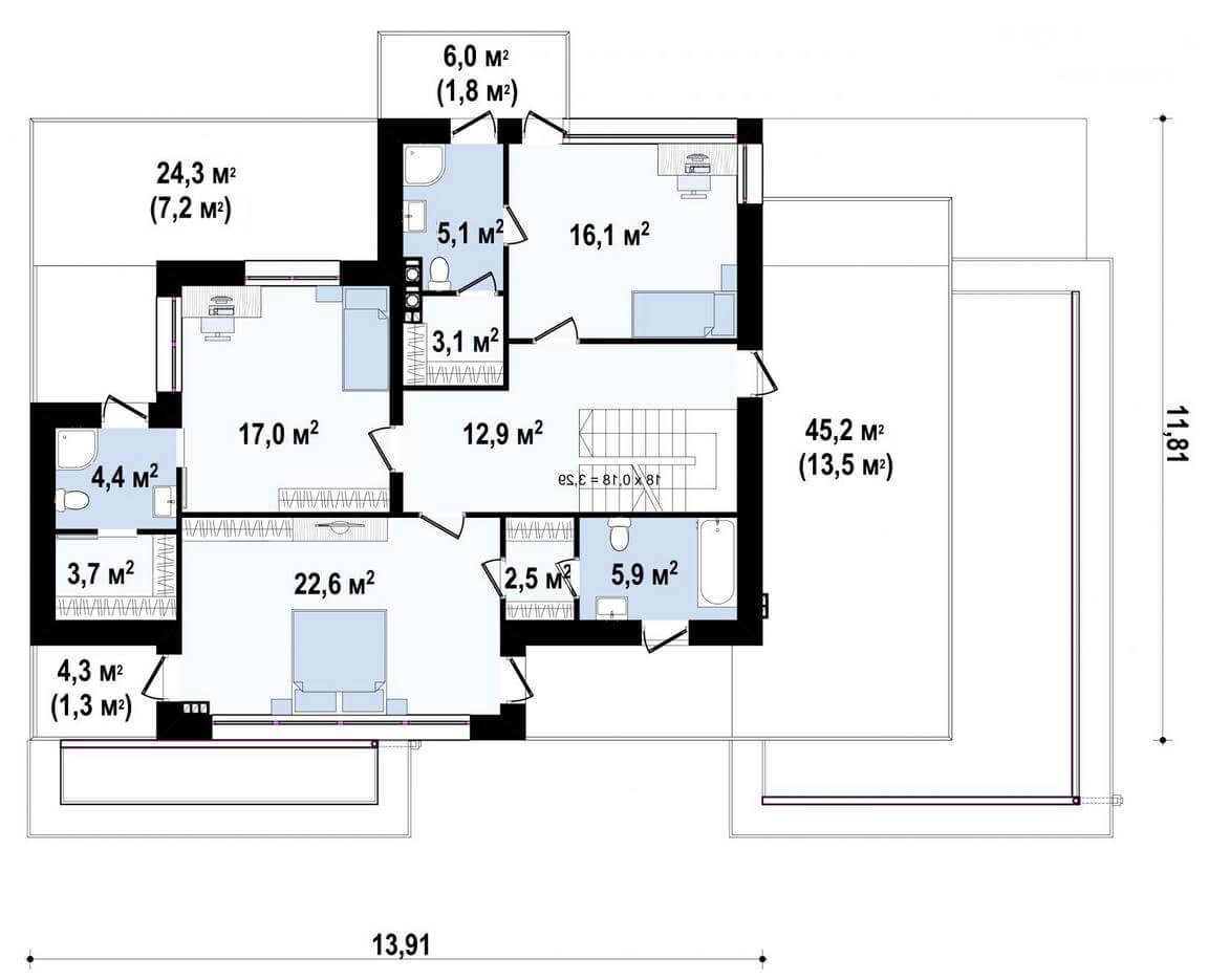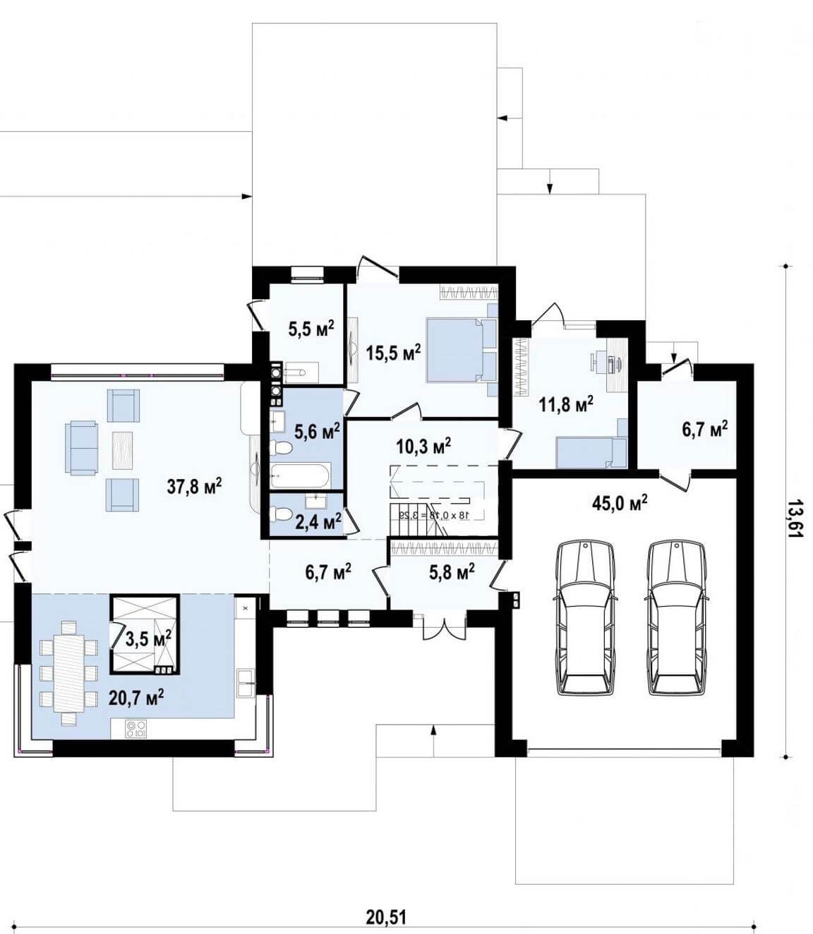 Вместительная двухэтажная вилла площадью 477 м2 станет достойным украшением любого загородного участка. Владельцам транспортных средств придется по вкусу автомобиль на два места.